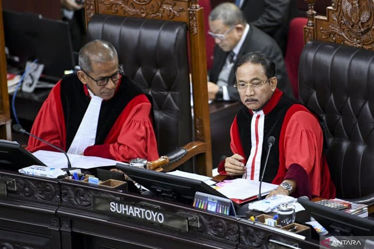 TIMES Tangerang/Ketua Mahkamah Konstitusi (MK) Suhartoyo (kanan) bersama Wakil Ketua MK Saldi Isra memimpin sidang pengucapan putusan perkara dilanjutkan atau tidak (dismissal) sengketa Pilkada 2024 di Gedung Mahkamah Konstitusi, Jakarta, Rabu (5/2/2025). (ANTARA)